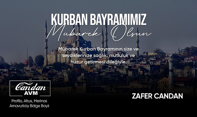 Candan AVM Profilo, Altus, Merinos Arnavutköy Bölge Bayii Zafer CANDAN Kurban Bayramı İçin Yayınladığı Bayram Mesajında Şu İfadeleri Kullandı "Kurban Bayramının tüm dünyada sevgi, hoşgörü ve kardeşlik duygularını pekiştirmesini dilerim. Bayramınız mübarek olsun!"