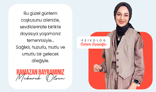 Psikolog Özlem Ziyaoğlu, Ramazan Bayramı vesilesiyle bir mesaj yayınladı. Ziyaoğlu mesajında; "Bayramlarda, sevgi, saygı, özveri, fedakârlık ve güzellikler adına ne varsa harmanlayıp bunları gönülden gönüle sunabilmeliyiz. Farklı düşüncelerden dolayı insanları yargılamadan, sınıflandırmadan ve ötekileştirmeden gönül kapılarımızı birbirimize açmalı, aramıza koyduğumuz mesafeleri kaldırarak şefkat ve merhamet elimizi birbirimize uzatmalıyız. Varlık sebebimiz ve hayır dualarına her zaman muhtaç olduğumuz aile büyüklerimizi ziyaret etmeli, çocukları sevindirmeliyiz.